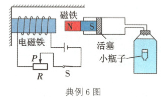典例6 (2023·宿迁)在科技晚会上,小明给大家展示了一个“听话”的小瓶子,通过调节滑片,就可以让小瓶子上浮、下沉或悬停在水中,它的原理如图所示(磁铁固定在活塞上)。 闭合开关S后,滑动滑片P,使小瓶子悬停在图示位置。 对此,下列分析正确的是 ( )