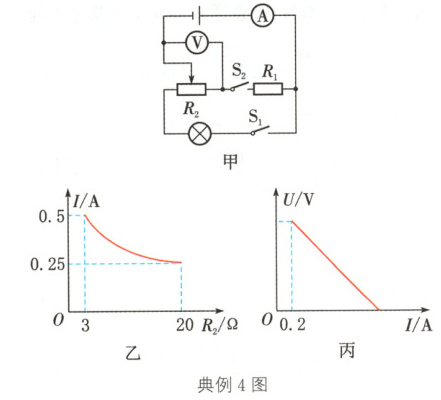 典例4(抚顺中考)如图甲所示,电源电压保持不变,电阻R₁的阻值为13Ω。只闭合开关S₁,将滑动变阻器R₂的滑片从最右端向左移动,直至小灯泡正常发光。图乙是电流表示数与滑动变阻器R₂接入阻值关系的图像。小灯泡正常发光时,R₂两端的电压为________V。保持滑片位置不动,断开S₁、闭合S₂,再将滑片向右移动。图丙是电压表与电流表示数关系的图像。则电源电压为________V,小灯泡的额定功率为________W。