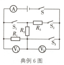典例6(2024·广元)如图的电路中,电源两端电压U恒为6V。只闭合开关S和S₂,电压表V₁、V₂的示数分别为U₁、U₂,电流表示数为I₁,电路的功率为P₁;只闭合开关S、S₁和S₃,电流表示数为I₂,电路的功率为P₂。已知R₂ = 10Ω,U₁∶U₂ = 1∶2,I₁∶I₂ = 1∶9。下列关系式正确的是( )