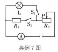 典例7(南通中考)如图所示的电路中,电源电压恒定,小灯泡L标有“6V 4.8W”的字样,电阻R₁的阻值为10Ω,滑动变阻器R₂标有“20Ω 0.5A”的字样。当R₂的滑片P置于最左端时,只闭合S₁,灯泡正常发光。