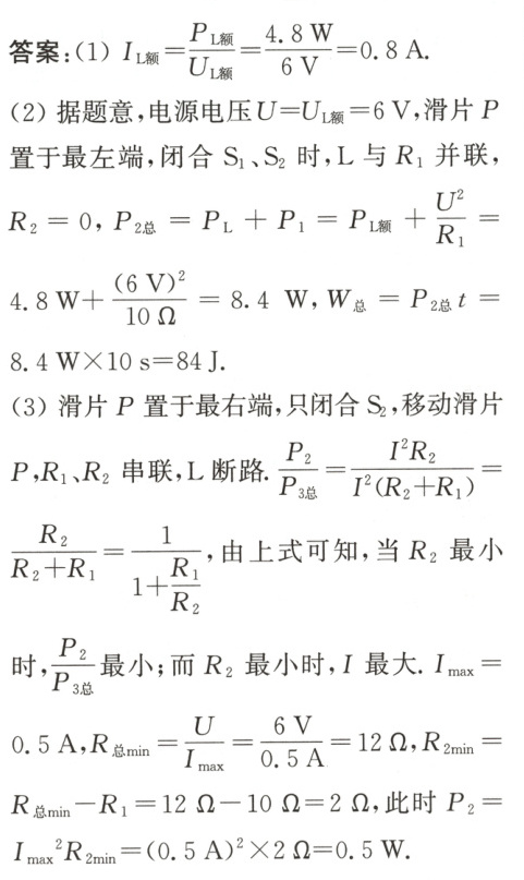 (3)先推出$\frac{P_{2}}{P_{3总}}$ = $\frac{1}{1+\frac{R_{1}}{R_{2}}}$,再运用公式分析法可知:R₂最小时,$\frac{P_{2}}{P_{3总}}$最小。P₂ = I²R₂→$\begin{cases}R_{2min}\xrightarrow{R_{总}=R_{1}+R_{2}}R_{总min}\xrightarrow{I=\frac{U}{R_{总}}}I_{max}\\R_{2}=R_{总min}-R_{1}\xrightarrow{}R_{总min}=\frac{U}{I_{max}}\end{cases}$。
