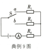 典例9 如图所示,电源电压保持不变,电阻R1:R2 = 1:2,当开关S接触a时,电流表的示数为0.3 A,R1消耗的功率为P1;当开关S接触b时,电阻R0消耗的功率是0.8 W,R2消耗的功率为P2,且P1:P2 = 9:8,则R1 =_______ Ω,电源电压U =_______ V。