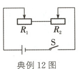 解析:设电源电压为U,R1、R2的最大值分别为R1、R2,两个滑动变阻器滑片可移动的最大距离为a cm,则滑片移动3 cm时,滑动变阻器连入电路电阻的变化量为最大阻值的$\frac{3}{a}$。据$P = \frac{U^2}{R}$和题意:R1、R2的滑片均位于变阻器的正中间时,$\frac{U^2}{0.5R_1 + 0.5R_2}=0.4 W$ ①;将R1的滑片由中间向左移动3 cm,R2的滑片由中间向右移动3 cm时,$\frac{U^2}{0.5R_1 + \frac{3}{a}R_1 + 0.5R_2 + \frac{3}{a}R_2}=0.3 W$ ②;将R1、R2的滑片从正中间均向右移动3 cm时,$\frac{U^2}{0.5R_1 - \frac{3}{a}R_1 + 0.5R_2 + \frac{3}{a}R_2}=0.5 W$ ③;将$\frac{①}{②}$可得$\frac{0.5 + \frac{3}{a}}{0.5}=\frac{4}{3}$,解得a = 18 ④,将④分别代入②③,再将$\frac{②}{③}$可得$\frac{R_1 + 2R_2}{2(R_1 + R_2)}=\frac{3}{5}$,整理得$\frac{R_1}{R_2}=4$。