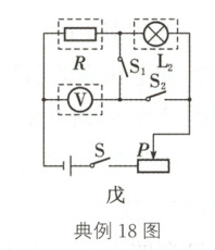 (2)要测出小灯泡L2的额定功率,应测出L2中的电流为0.5 A时L2两端的电压,因为定值电阻R的阻值已知,所以在图丙中将小灯泡L2与R串联,将电压表与R并联,当电压表的示数UR = 0.5 A×R时,L2正常发光,消耗的电功率为其额定功率。在图丙左上方的虚线框内补上R,左下方的虚线框内补上V,右上方的虚线框内补上L2。