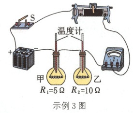 示例3 (泰州中考)如图所示为小明“探究影响电流热效应的因素”的实验装置,在甲、乙两瓶中装入质量和初温均相同的煤油,$R_{1}、R_{2}$采用图示连接方式的目的是____________________。闭合开关一段时间后,乙瓶中温度计的示数较高,由此说明通电导体产生的热量与________有关。小华用相同装置(煤油质量也相等)同时进行实验,细心的小红看到小明和小华两组电阻丝阻值相等的烧瓶中,小华这一组的煤油升温比小明的快,比较发现:小华的滑动变阻器接入电路的阻值较小,根据这一现象,小红________(能/不能)初步判断出通电导体产生的热量与通过导体的电流有关。