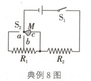 典例8(常州中考)严寒冬季,我国北方哨兵脚上穿有电热靴. 一只靴内的加热电路如图所示,电源电压恒定,S₂为三挡旋钮开关(金属片M可分别拨至a、b、c处),电阻丝R₁、R₂规格相同且阻值不变,b为电阻丝R₁的中点. 这只电热靴的低温挡为6 W,则其中温挡和高温挡分别为( )