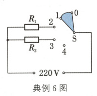 典例6(2024·成都)小张想设计一个有“低温”“中温”和“高温”三个挡位的电加热器,其电路图如图所示,电源电压为220 V,R₁、R₂是电热丝,开关S接触相邻的两个触点. 她准备了三根电热丝,R₁ = 242 Ω,另外两根电热丝的阻值分别是121 Ω和242 Ω,R₂该选取阻值为________Ω的电热丝. 开关S接触“1”“2”两个触点时,通电1 min,电流产生的热量是________J.