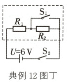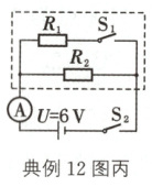 典例12(镇江中考)张老师向同学们展示了一个具有高、低温两挡调节功能的自制电加热器,并告知其内部电路由电阻丝R₁、R₂和开关S₁三个元件组成,两根电阻丝允许通过的最大电流均为1 A,R₁ = 10 Ω. 在不拆解加热器的情况下,小军用如图甲所示电路对其进行探究:他先闭合S₂,电流表的示数为0.24 A;再闭合S₁,电流表的示数变为0.84 A,所用电源电压为6 V.