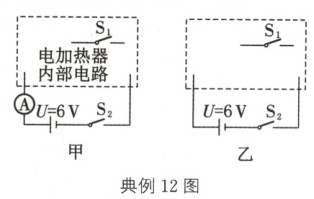 (3)W = Q吸 = cmΔt = 4.2×10³ J/(kg·℃)×0.1 kg×7.2 ℃ = 3024 J. R高 = $\frac{U^{2}t}{W}$ = $\frac{(6 V)^{2}×14×60 s}{3024 J}$ = 10 Ω = R₁,据P = $\frac{U^{2}}{R}$可知,改装后的电加热器内部电路的连接情况是S₁与R₂并联后再与R₁串联,当S₁、S₂均闭合时为高温挡;当S₁断开,S₂闭合时为低温挡,电路如图丁所示.