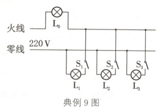典例9(长沙中考)如图所示为一条刚装好的家庭电路.在未装保险丝之前,先把灯泡L₀接在装保险丝的两个接线柱上.当只闭合S₁时,L₀和L₁发光都偏暗;当只闭合S₂时,L₀正常发光;当只闭合S₃时,L₀不发光.则下列判断正确的是(四只灯泡的额定电压均为220 V)( )