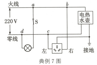 典例7(烟台中考)如图所示为小明家的部分电路,他将电饭煲的插头插入三线插座后,正在烧水的电热水壶突然停止工作,但电灯仍正常发光,拔出电饭煲的插头,电热水壶仍不能工作,把测电笔分别插入插座的左、右孔,氖管均发光.若电路中只有一处故障,则( )