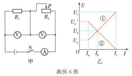 典例6(苏州中考)在如图甲所示的电路中,电源电压保持不变,R1为定值电阻.闭合开关S,将滑动变阻器R2的滑片P从最左端滑到最右端,两电压表示数随电流表示数变化的完整图线如图乙所示.下列说法正确的是( )