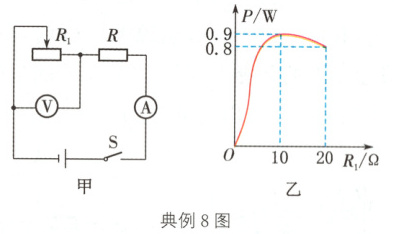 典例8(连云港中考)在如图甲所示的电路中,R为定值电阻,R1为滑动变阻器.如图乙所示为该滑动变阻器滑片从一端滑至另一端过程中变阻器的电功率与其电阻的关系图像.下列说法正确的是( )