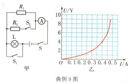 典例9(2023·苏州)如图甲所示的电路,R1阻值为20 Ω,图乙为小灯泡L的U - I图像.闭合开关S、S1,断开开关S2,电流表示数为0.4 A,再闭合开关S2,电流表示数变为0.6 A.求: