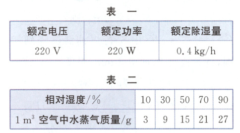 解析:(1)I额 = $\frac{P_额}{U_额}$ = $\frac{220W}{220V}$ = 1 A,除湿1 h消耗的电能W = P额t = 0.22 kW×1 h = 0.22 kW·h,电能表指示灯闪烁的次数n = $\frac{0.22kW·h}{1kW·h}$×1 200 imp = 264 imp.(2)由表二可知,环境温度为30 ℃时,相对湿度与1 m³空气中水蒸气质量成正比,相对湿度为80%时,1 m³空气中水蒸气的质量m = $\frac{80\%}{10\%}$×3 g = 24 g.房间内空气的体积约为12 m²×3 m = 36 m³,使房间相对湿度由80%降至50%,水蒸气的质量减少约为36 m³×(24 g/m³ - 15 g/m³)=324 g = 0.324 kg,若除湿器以额定除湿量工作,约需t = $\frac{0.324kg}{0.4kg/h}$ = 0.81 h.