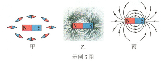 示例6 (北京中考)某同学研究磁体周围的磁场情况,将一根条形磁体放在水平桌面上,在它周围放置一些小磁针,小磁针的指向情况如图甲所示;将小磁针拿掉之后,在条形磁体上面放一块有机玻璃,玻璃上均匀撒一层铁屑,轻轻敲打玻璃,可以看到铁屑的分布情况如图乙所示;根据图甲和图乙所示的实验现象,用磁感线描述条形磁体周围的磁场情况如图丙所示。下列说法错误的是 ( )