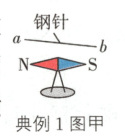 典例1(丽水中考)如图甲,小科在实验室发现一枚钢针,为能快速利用小磁针判断:① 钢针是否有磁性,② 若有磁性则磁极如何分布,