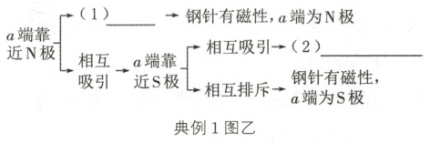 解析:本题中若钢针有磁性,且a端为N极,则a端靠近小磁针的N极时,两者相互排斥. 将钢针的a端靠近小磁针的N极,两者相互吸引的原因有两种可能:一是钢针没有磁性,磁体具有吸铁性;二是钢针有磁性,a端为S极,异名磁极相互吸引. 再将钢针的a端靠近小磁针的S极,若两者仍相互吸引,则钢针没有磁性;若两者相互排斥,则钢针有磁性.