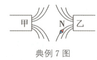 典例7(金华中考)甲、乙为不同条形磁铁的两个磁极,弧线是部分未标方向的磁感线,如图所示. 根据图中小磁针静止时的指向判断甲、乙的磁极,下列描述正确的是( )