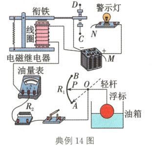 典例14(扬州中考)如图所示为一种自动测定油面高度的装置.电源电压U为6V,R1是最大电阻为30Ω的滑动变阻器,它的金属滑片P连在杠杆一端,R2是定值电阻,油量表是用量程为0~0.6A的电流表改装而成的.(A、B、C、D四点表示四个接线柱,电磁继电器线圈电阻忽略不计)