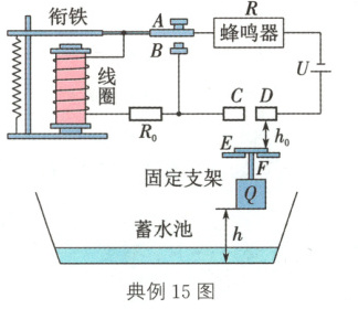 典例15(镇江中考)小华制作的蓄水池水位报警模拟装置如图所示,浮子由铜片E、空心杆F和木块Q构成.在低水位时,触点C、D位于E的正上方h0处,Q的下表面距池底的高度为h.当水位上升到使E与C、D接触后,蜂鸣器R发出忽强忽弱的报警音,报警音的强弱取决于其两端电压大小.电源电压U=6V,定值电阻R0=3Ω,R可视为阻值为9Ω的定值电阻,不计其他电阻.