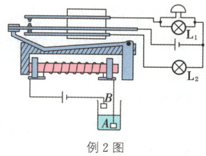 例2 如图所示为水位自动报警器的工作原理图. 当水位上升到金属片B处时,报警电路中的灯________亮.