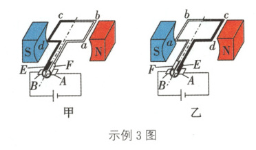 示例3 如图甲、乙所示为直流电动机在两个不同时刻的工作原理图。 根据图示,下列对直流电动机工作原理的分析,错误的是( )
