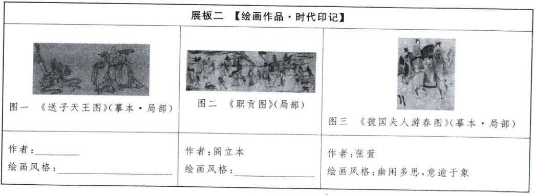 绘画风格:落笔雄劲,风格奔放。(1分)图二绘画风格:人物形态各异,神形兼备。(1分)图三题材内容:开放的社会风气。(1分)