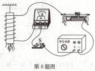 8 .(2024·河北石家庄模拟)小明想探究影响电磁铁磁性强弱的因素,用表面涂有绝缘漆的电阻丝和两根相同的软铁棒分别绕制了匝数为100匝和150匝的电磁铁A、B. 实验中可以根据电磁铁吸引铁钉的数量来判断其磁性强弱. 小明将电磁铁A接入如图所示的电路中,调节滑动变阻器,进行多次测量,电流表的示数和对应的电磁铁吸引铁钉的数量,如表所示.