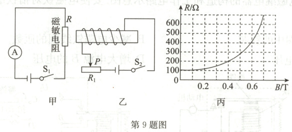 9. 物理学中,用磁感应强度(用字母B表示)来描述磁场的强弱,国际单位是特斯拉(用字母T表示),磁感应强度B越大表示磁场越强,B = 0表明没有磁场. 有一种电阻,其阻值大小随周围磁感应强度的变化而变化,这种电阻叫磁敏电阻. 为了探究电磁铁磁感应强度的大小与哪些因素有关,小超设计了如图甲、乙所示的电路,图甲中电源电压恒为6V,R为磁敏电阻,图乙中的电磁铁左端靠近且正对图甲中的磁敏电阻R,磁敏电阻R的阻值随周围磁感应强度变化的关系图像如图丙所示.