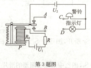 3. (2024·湖南益阳二模)小明利用热敏电阻设计了一个过热自动报警电路,如图所示.将热敏电阻R安装在需要探测温度的地方,当环境温度正常时,继电器衔铁与上触点接触,下触点分离,指示灯亮;当环境温度超过某一值时,继电器衔铁与下触点接触,上触点分离,警铃响.图中热敏电阻R的阻值随温度升高而减小,继电器线圈用漆包线绕成,阻值恒为R₀.下列说法正确的是 ( )