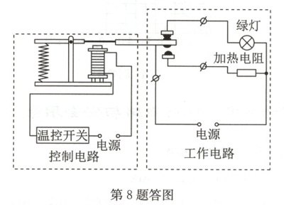8. (2023·辽宁丹东一模)某同学设计的冬季家庭温度自动控制器的工作原理如图所示.当室内温度低于25℃时温控开关闭合,绿灯不亮,加热电阻工作;当室温高于25℃时,温控开关断开,绿灯亮,加热电阻不工作,表示温度已经达到25℃.请根据以上要求,用笔画线代替导线,完成工作电路部分的连接.