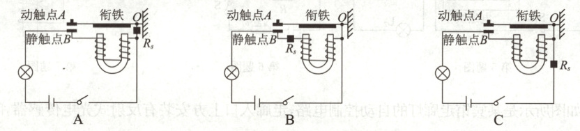 【项目实施】(1)转向灯警示时要具备“一亮一暗”持续闪烁的功能;雾天湿度增加,能见度低.设计优化要求:雾天时仍能闪烁,需要“一亮”时灯发光比平时更亮,“一暗”时亮度无要求,从而提高警示功能.已知湿敏电阻Rs的阻值随湿度的增大而减小,线圈有电阻,衔铁电阻忽略不计,衔铁具有弹性.下列能实现设计功能的一项是________(填选项字母).