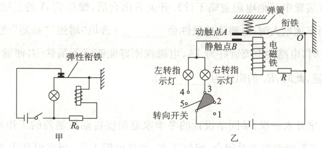 为了操作方便,于是想将转向指示灯和“警示灯”整合在同一个电路中,并设计了如图乙所示的电路图,接通相应指示灯后,该指示灯会亮、暗(微弱发光)交替闪烁发光,R为定值电阻,电磁铁线圈及衔铁电阻忽略不计.