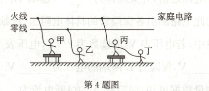 4. 如图所示,甲站在干燥的木桌上一只手接触到火线,乙站在地上一只手接触到零线,丙站在干燥的木桌上一只手接触到火线,此时,丁站在地面上用手去拉丙.则 ( )