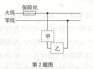 2. 某家庭电路的部分电路如图所示,其中甲、乙两处分别装用电器和开关.对此电路,下列说法正确的是 ( )