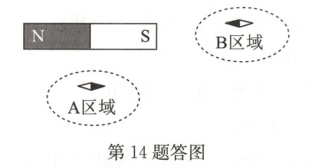 14. 如图所示,条形磁铁静置于水平面上,将两枚相同的小磁针分别置于磁铁周围的A、B区域.请在图中两虚线框内画出小磁针静止时的情形.(用“”表示小磁针,涂黑端表示N极)
