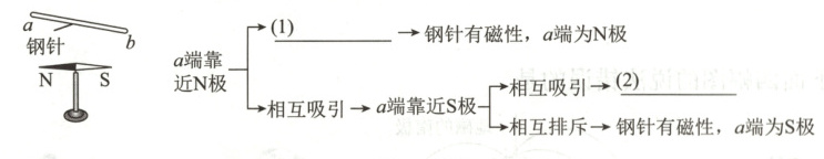 13.小科在实验室发现一枚钢针,为能快速利用小磁针判断:①钢针是否有磁性,②若有磁性,则磁极如何分布,小科画出思维导图,请补充完整.