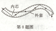 8 (2024·甘肃武威模拟)光纤通信主要利用波长很______(选填“短”或“长”)的激光传输信息。如图所示,激光从光纤一端射入,在内壁上多次______,从另一端射出,把信息传到远方。无线电广播的音频信号在发射出去之前,必须加载到频率更______(选填“高”或“低”)的电流信号上。