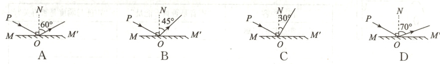 4.如图所示的四个光路图中,MM'为平面镜,PO为入射光线,ON为法线,入射角∠PON等于60°,其中符合光的反射定律的光路图是 ( )