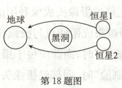 18.黑洞是宇宙中质量很大的天体.如图,两恒星1、2发出的光在经过某黑洞附近时发生了弯曲之后射向地球,地球上的人类观测到恒星1的位置比原位置_______(选填“偏高”“偏低”或“不变”);若在黑洞的位置用一个光学元件代替它对光的作用(光学元件的尺寸可大于黑洞),该光学元件为_______.