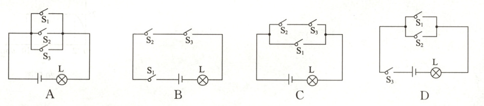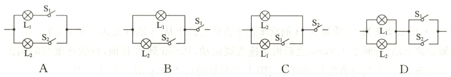 3.(2023·安徽)老师给小龙一个密封盒,其表面可见两个开关S₁、S₂和两盏灯L₁、L₂. 为了探究开关和灯在密封盒内是如何连接的,小龙进行了如下操作:先闭合S₁,只有灯L₁发光;又闭合S₂,两灯都发光;再断开S₁,两灯都熄灭. 符合上述实验结果的连接方式为 ( )