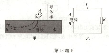 14. 电鳗是一种能对外界施加电压的动物,如图甲所示,为了研究电鳗的放电行为,研究人员把一根导体棒伸进水中,放电的电鳗可看成电源,A、B两点是电源两极.