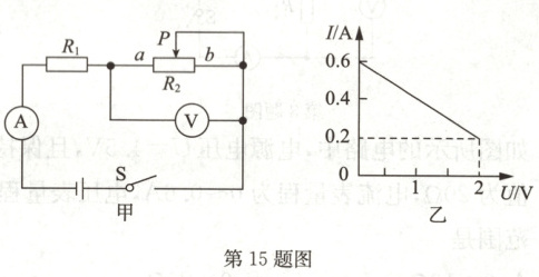 15. 如图甲所示的电路中,R₁为定值电阻,R₂为滑动变阻器,电源电压不变. 闭合开关S后,滑片P从a端移动到b端,电流表示数I与电压表示数U的变化关系如图乙所示,则电源电压为______V,R₂的最大阻值为______Ω.