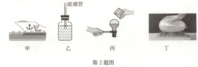 D. 图丁:对放在钉板上的气球施加一定压力,气球没有被刺破是因为增大了受力面积,减小了压强