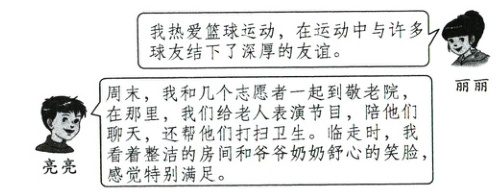 (1)丽丽:与人交往。(1 分)亮亮:参与有意义的社会活动。(1 分)