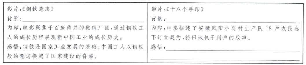 问题1:第一组同学在观看了影片《钢铁意志》和《十八个手印》后,准备从以上角度撰写影评,请你完成相关内容的填写。(4分)