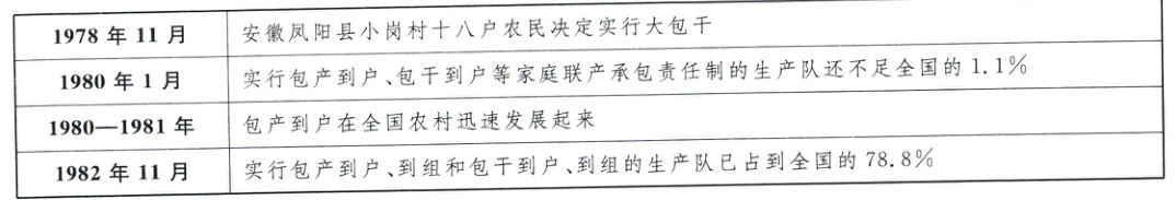 A 【解析】本题考查的是农村经济体制改革的相关知识。根据表格内容可知,1980年实行家庭联产承包责任制的生产队还不足全国的1.1%,到1982年11月时,已经占到全国的78.8%,由此可见,家庭联产承包责任制的实行是一步步逐渐推广开来的,体现了农村改革具有渐进性特点,A符合题意;农村经济性质仍然是公有制性质,没有发生变化,排除B;题干没有体现农业机械化水平大大提高,排除C;家庭联产承包责任制实行后,农民拥有的是土地的生产经营权,并没有获得土地所有权,排除D。故选A。