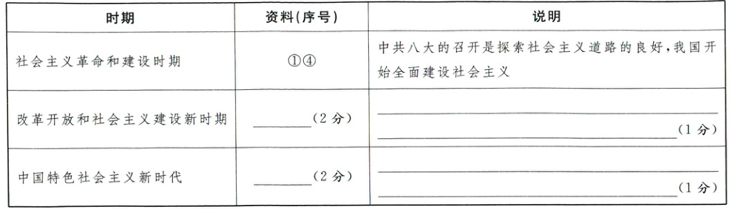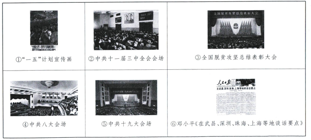 问题1:②⑤(2分) 问题2:改革开放和社会主义建设新时期:②⑥(2分)说明:中共十一届三中全会召开,作出了改革开放的历史性决策,我国开始进入改革开放和社会主义现代化建设新时期(1分)中国特色社会主义新时代:③⑤(2分)说明:脱贫攻坚取得全面胜利,实现第一个百年奋斗目标,开启实现第二个百年奋斗目标新征程,朝着实现中华民族伟大复兴的宏伟目标继续前进(1分)