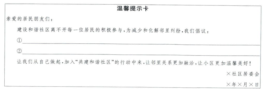 (2)社区居委会准备制作“温馨提示卡”发放给居民,请你提出两条倡议。(4分)